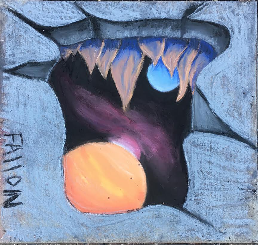 Not a “real” hole, but one created using a variety of technical strategies of color and composition to create the illusion of a hole - with an imaginary world beyond, or emerging, from this imaginary opening in the concrete. Employing techniques of overlapping, linear perspective, diminishing scale, color atmosphere, vertical placement and receding color, students created a series of surprising "tromp l’oeil" scenes (French for “deceive the eye”), interrupting the viewers’ perception of depth as they encountered the normally mundane concrete sidewalk just in front of the art room, J141, at the northeast end of campus.