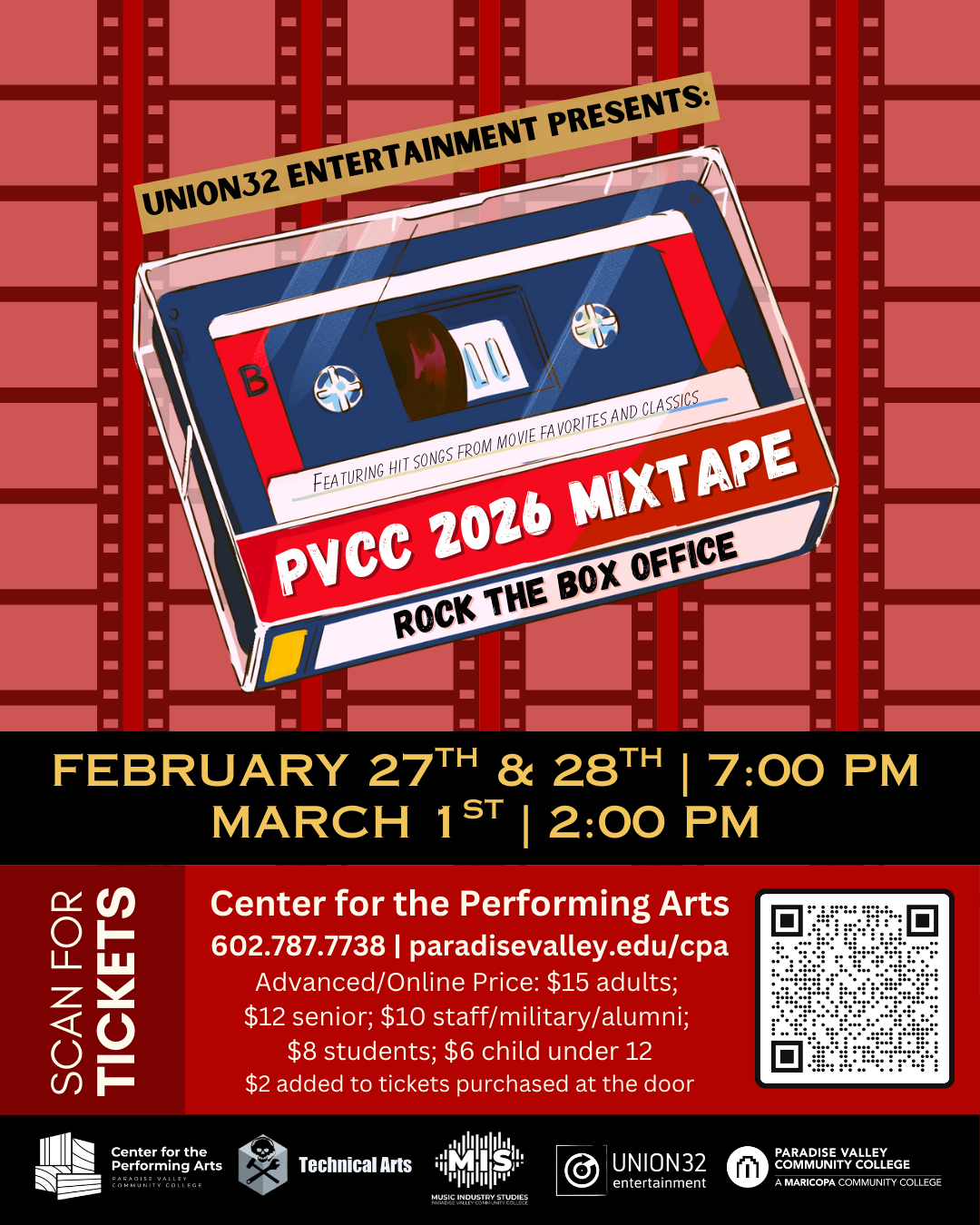 Join us for an exciting concert of music, choreography, and stunning visuals celebrating the greatest musical hits in our favorite movies! PVCC 2026 Mixtape: Rock the Box Office will be performed by the PVCC Faculty Rock Band with special guest vocalists and musicians from Paradise Valley Community College and high school students in dance, music technology, and theater programs at NVAA/Shadow Mountain High School.